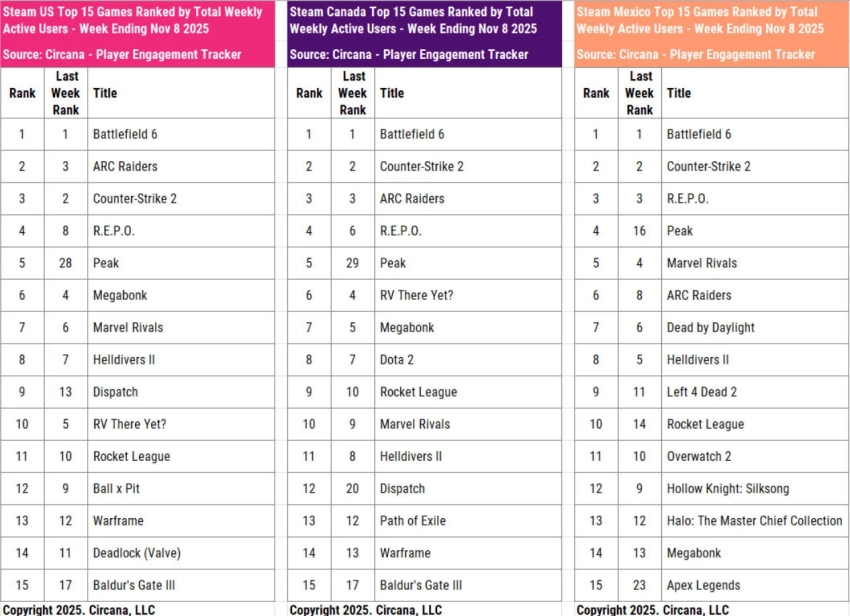 На втором месте по числу активных игроков на PC идёт ARC Raiders. Правда, в Канаде игра лишь закрыла тройку лидеров, уступив позиции Counter-Strike 2. Также аналитики обратили внимание на резкий скачок Peak. На прошлой неделе кооперативное приключение занимало 28-ю строчку, но благодаря крупному обновлению забралась на пятое место. Этого хватило, чтобы обогнать ту же Megabonk и Marvel Rivals, в которой на тот момент ещё не наступил пятый сезон.