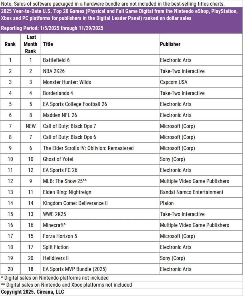 Следом за игрой EA вновь идут NBA 2K26 и Monster Hunter Wilds. А единственная новинка ноября, Call of Duty: Black Ops 7, расположилась только на седьмом месте.
