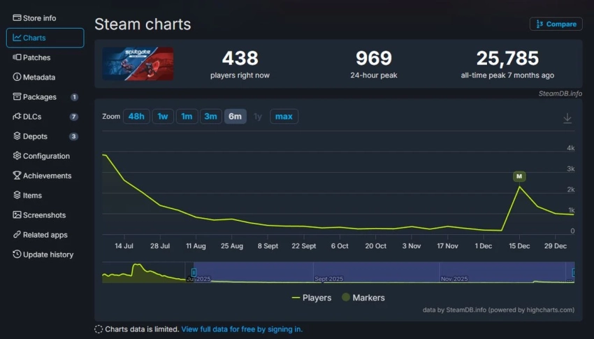Во-вторых, пиковый онлайн стремительно полетел вниз. Если на запуске летом шутеру удалось привлечь почти 26 тысяч одновременных пользователей, то с конца декабря показатель упал до 1000 игроков. А сейчас и вовсе опустился ниже.