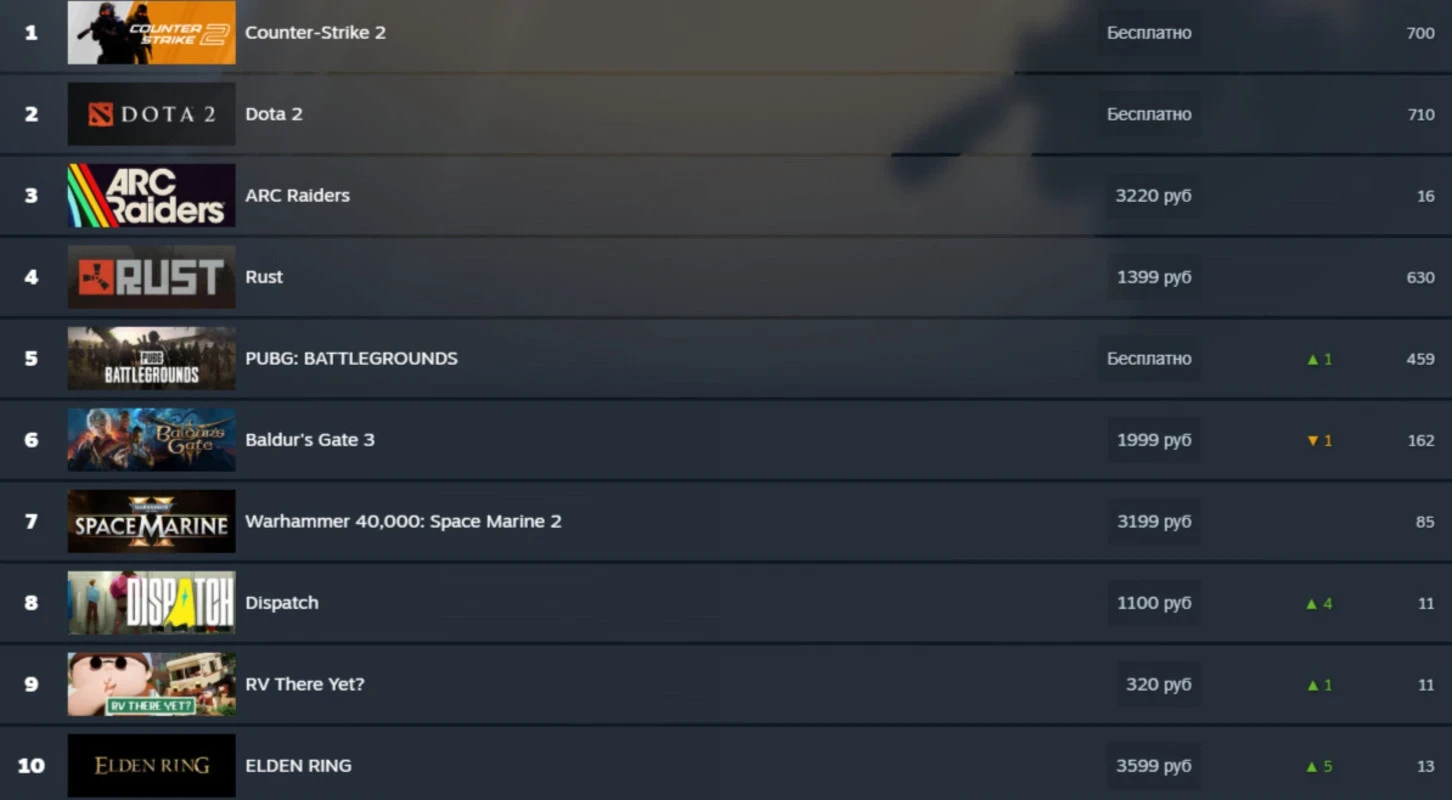 В российском чарте заметных изменений нет. В лидерах всё ещё Counter-Strike 2 и Dota 2, тройку лидеров замыкает Arc Raiders, а на 4 и 5 позициях находятся Rust и PUBG: Battlegrounds.