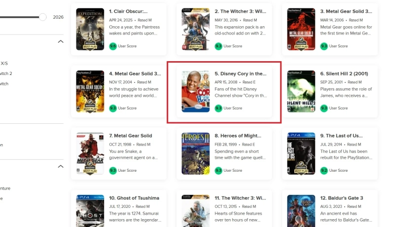 За последние несколько дней игра получила много отзывов с оценками 10 баллов. Её пользовательский рейтинг составляет 9,3 балла (рейтинга критиков нет). Теперь Disneyʼs Cory in the House находится на одной строчке с The Witcher 3: Wild Hunt — Blood and Wine, Metal Gear Solid 3: Subsistence, Metal Gear Solid 3: Snake Eater, Metal Gear Solid, Silent Hill 2 и Heroes of Might and Magic III.
