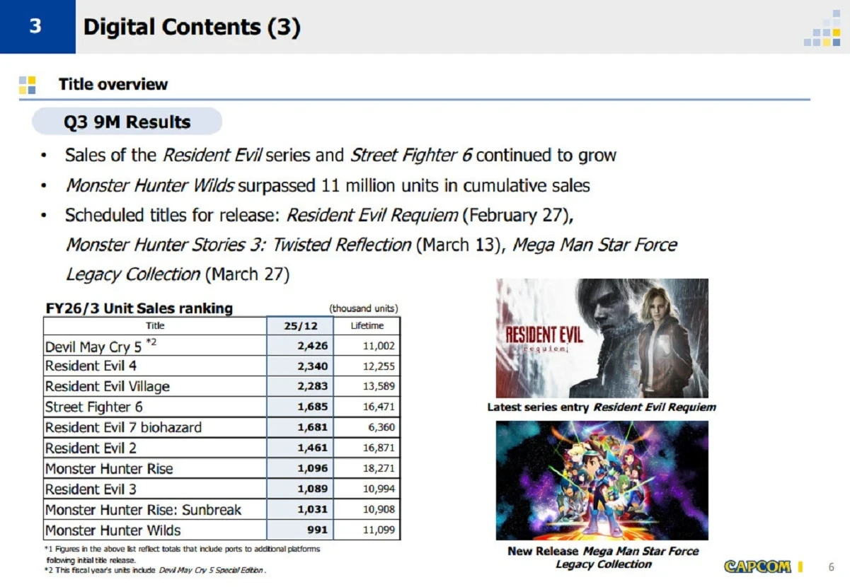 Среди продаж серий перестановок нет, зато некоторые из них успели прибавить ещё несколько миллионов копий в сравнении с весной 2025 года. Например, за девять месяцев различные части Resident Evil купили 13 миллионов раз. В случае с Monster Hunter и Devil May Cry рост составил 5 миллионов, а в мир Street Fighter прибыло ещё два миллиона бойцов.