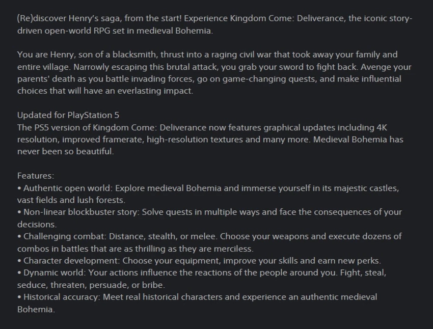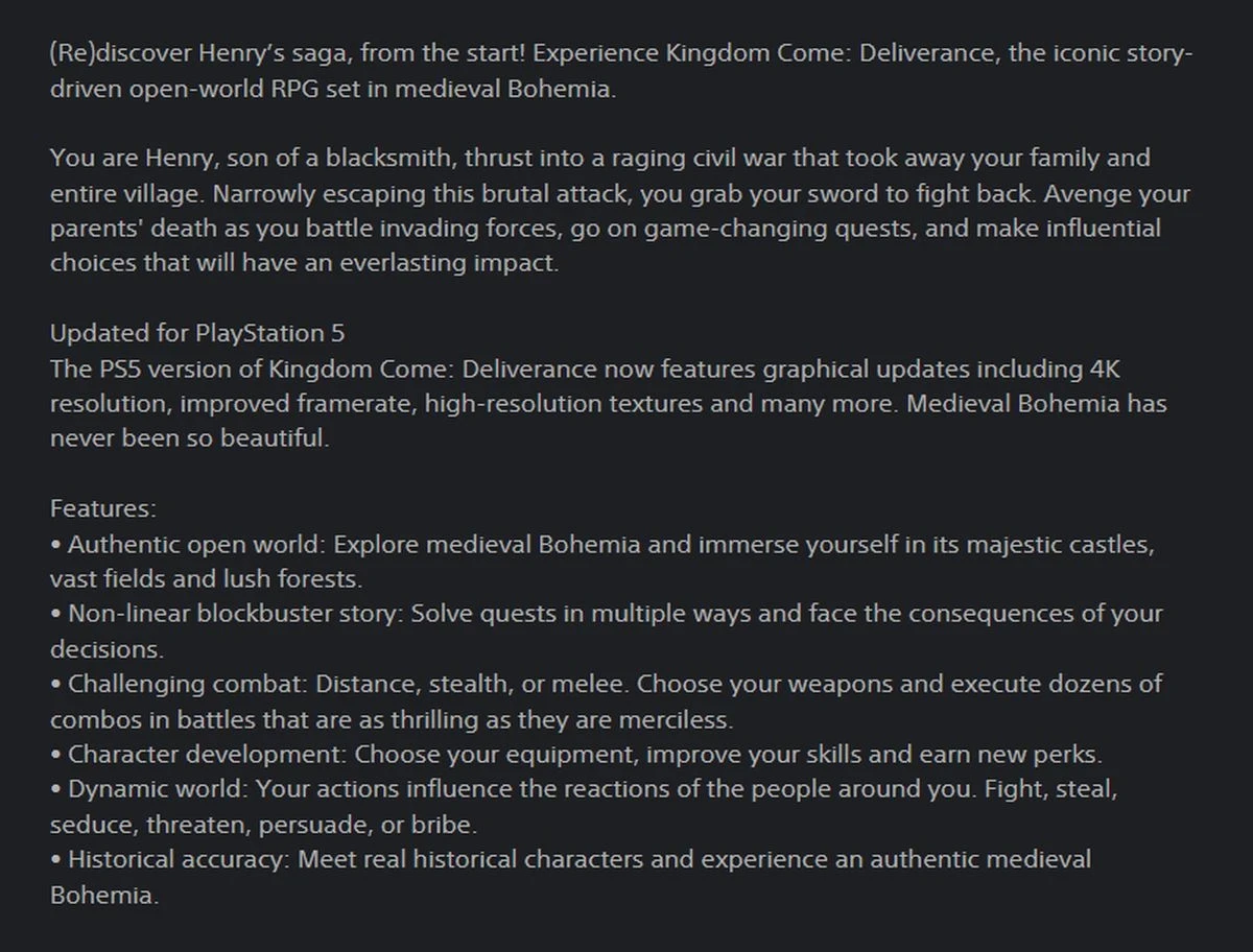 Обложка: скриншот Kingdom Come DeliveranceПохоже, что администрация PS Store раньше времени слила информацию о нативной версии Kingdom Come: Deliverance для PS5. Сейчас описание игры подредактировали, но интернет, как известно, помнит всё.