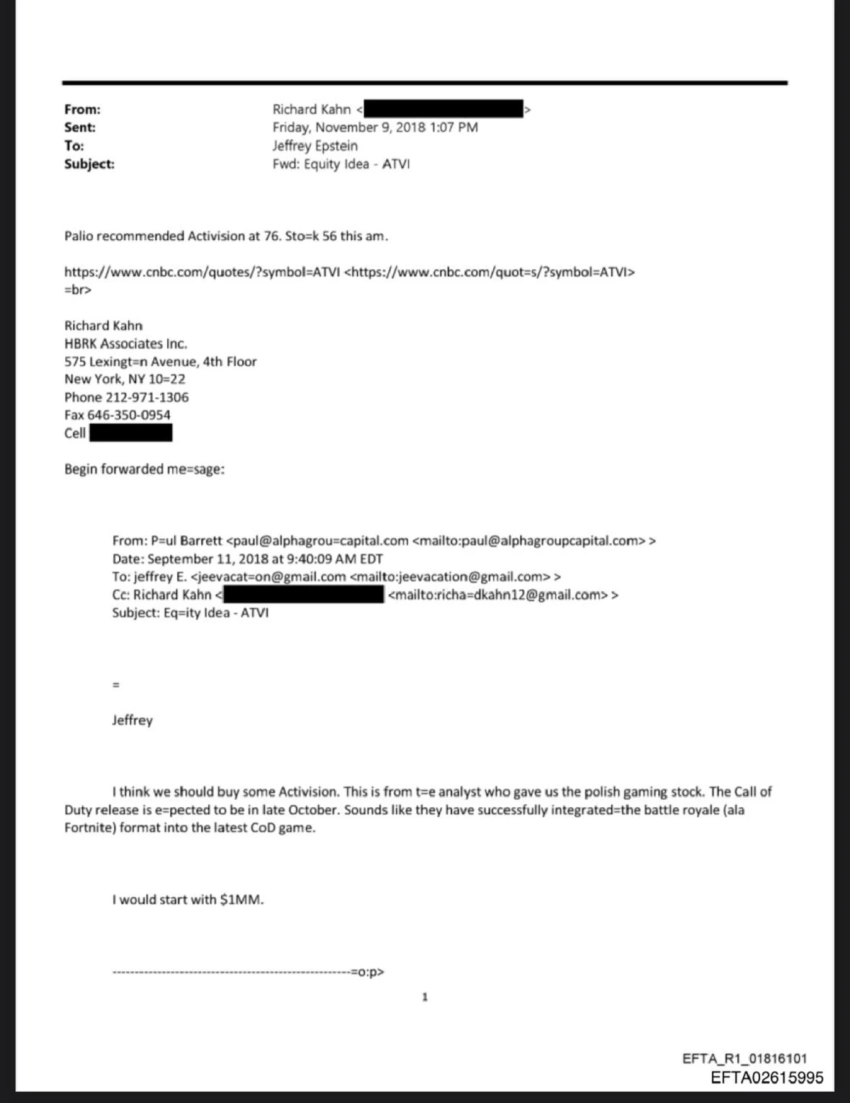 В другом письме советники Эпштейна советуют ему купить акции Activision Blizzard в 2018 году, перед релизом Call of Duty: Black Ops 4. Они объяснили это потенциальным успехом режима королевской битвы.