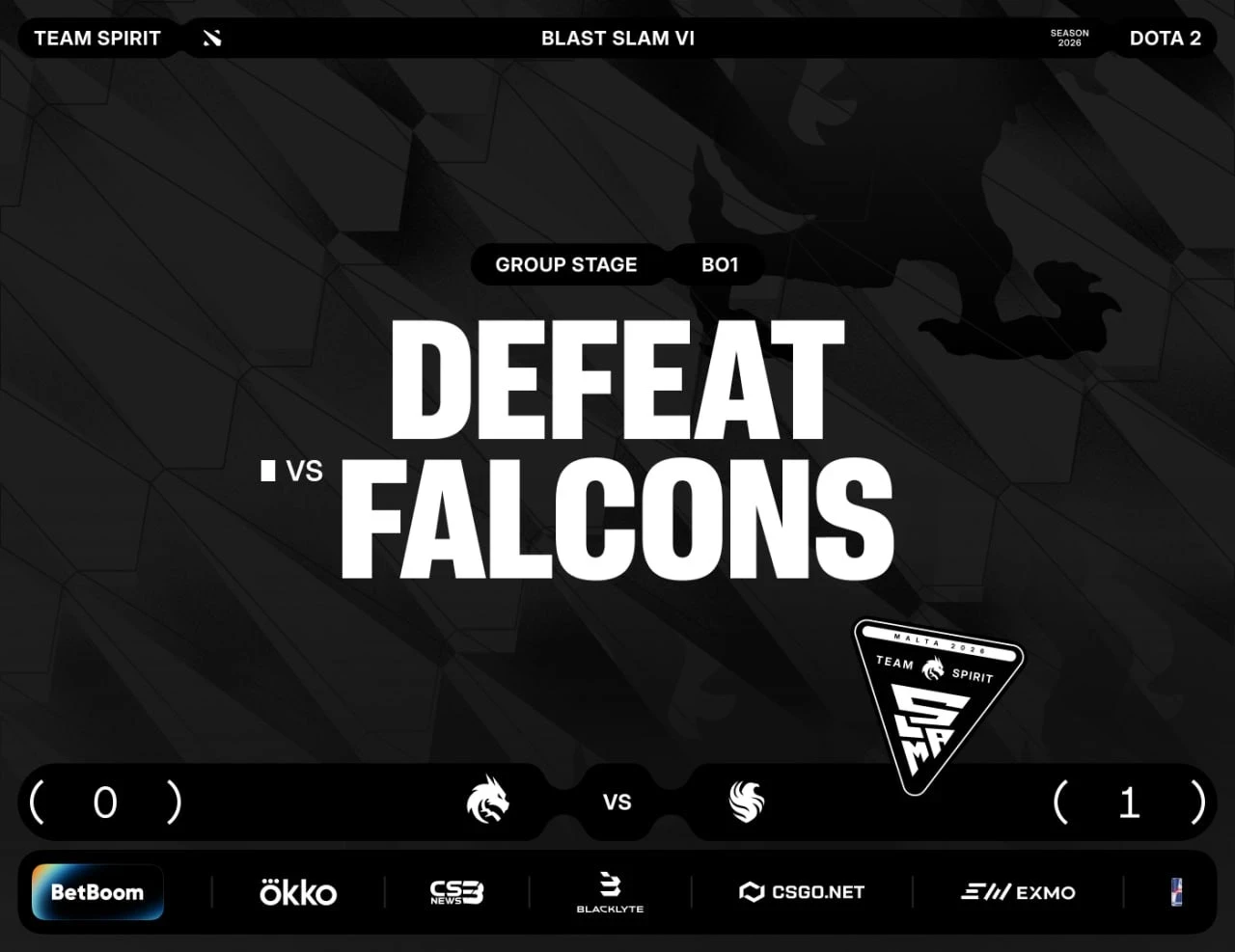 Источник: Team FalconsНа турнире BLAST Slam VI по Dota 2 состоялось одно из самых ожидаемых противостояний групповой стадии — битва двух победителей The International. Саудовская организация Team Falcons (чемпионы TI14!) встретилась с сербским клубом Team Spirit(чемпионы TI 11 и TI13!). Матч прошел в формате Best of 1 и завершился победой «соколов».