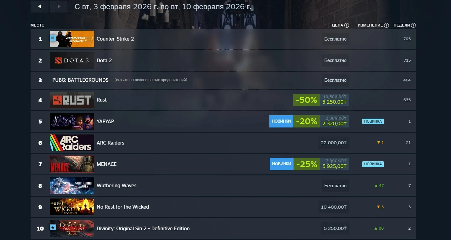 Единственной новинкой недели в первой десятке стала MENACE. Тактическая ролевая игра вышла в раннем доступе 5 февраля и приглянулась геймерам за масштабную кастомизацию. Новинка заняла девятое место.