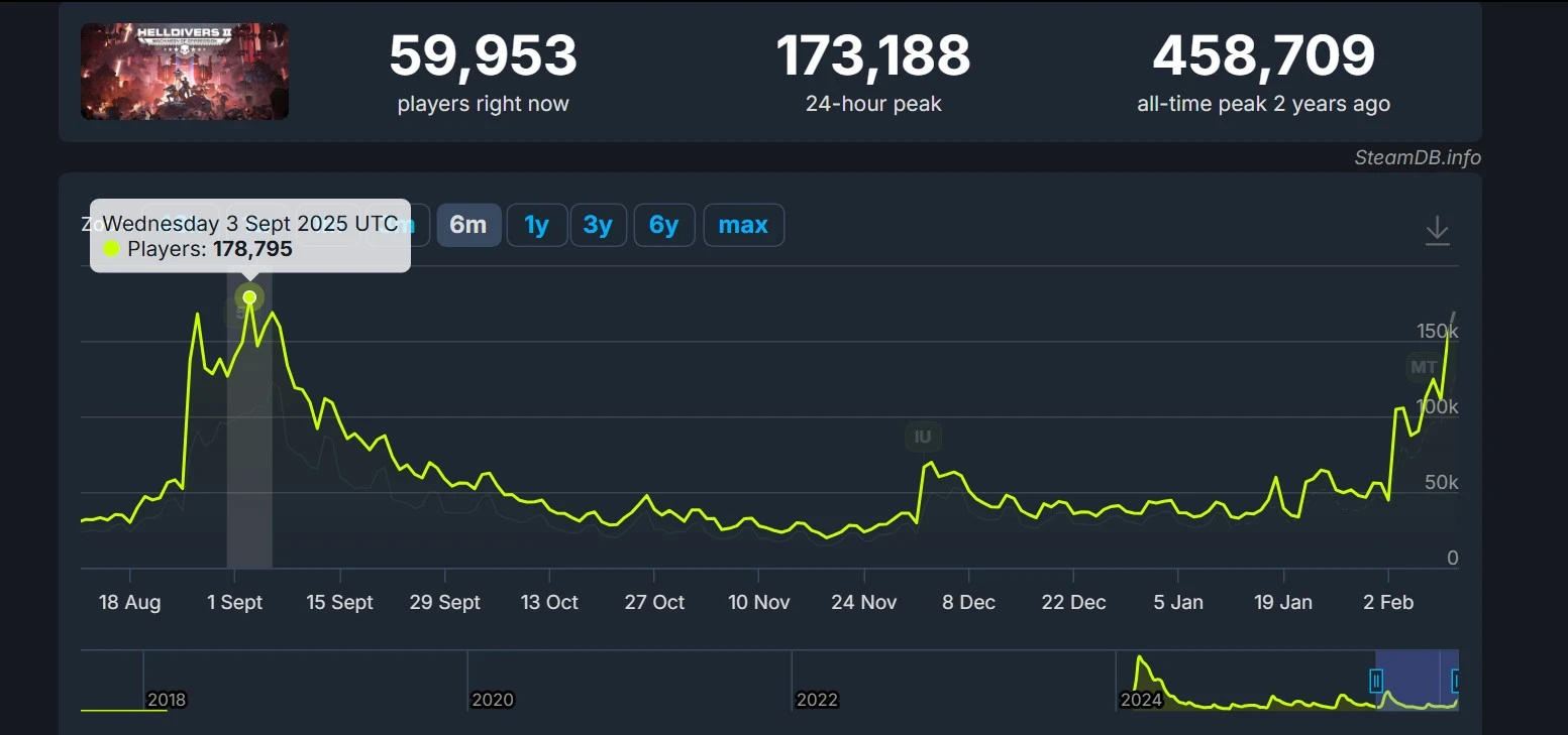 В последний раз Helldivers 2 посещало более 170 тысяч игроков на пике в Steam за 24 часа в сентябре. Именно тогда вышло крупное обновление Into The Unjust с мирами-ульями. При этом шутер продолжал наращивать число игроков в последние месяцы. Например, в начале февраля суточный онлайн превысил 100 тысяч игроков. Тогда как раз внесли правки в баланс оружия и не только.