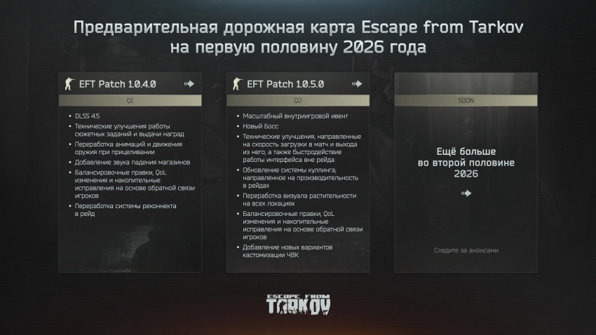 Обложка: скриншот Escape from TarkovРазработчики Escape from Tarkov опубликовали дорожную карту с планами на первую половину 2026 года. В ней содержатся два больших патча.