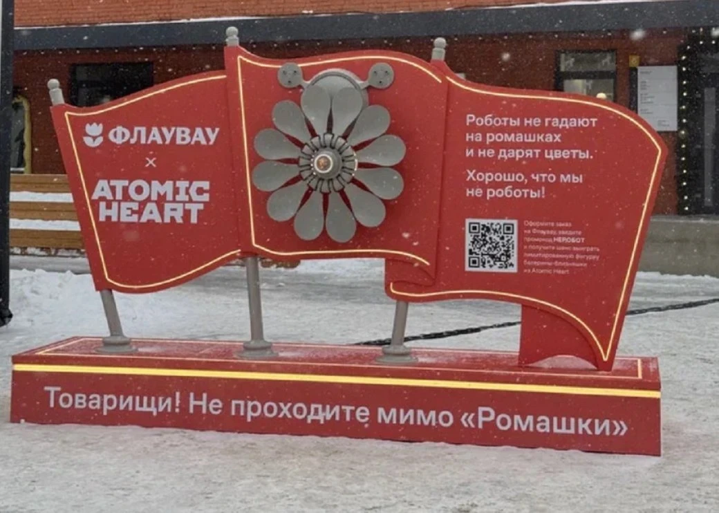 А ещё коллаборация Atomic Heart и «Флаувау» сопровождается арт-объектом «Ромашка», который установили на «Хлебозаводе» в Москве. Поклонники шутера должны сразу вспомнить камеры, которые засекают главного героя и натравливают на него суровых роботов. Однако воплощение «Ромашки» в реальном мире символизирует любовь и заботу.