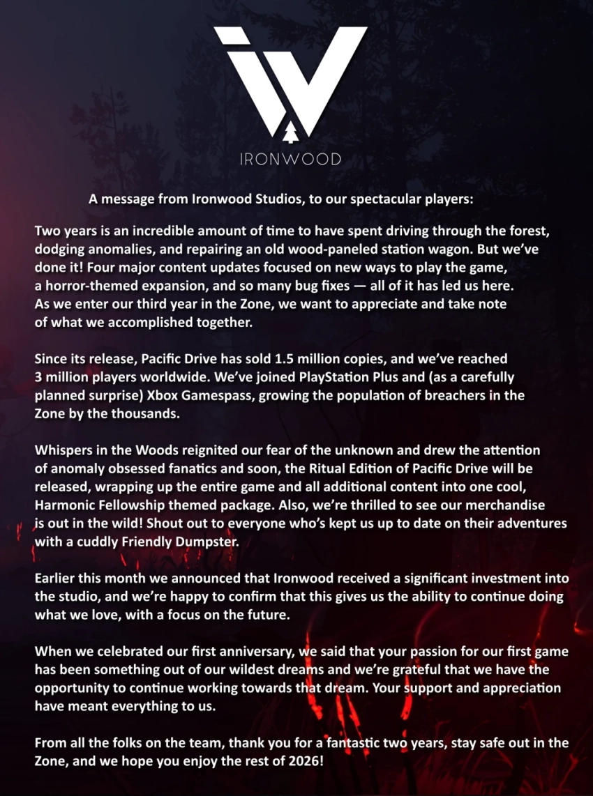 Обложка: скриншот игры Pacific DriveIronwood Studios отпраздновала вторую годовщину с релиза своей водительской выживалки Pacific Drive, напомнив о её (и не только) достижениях.