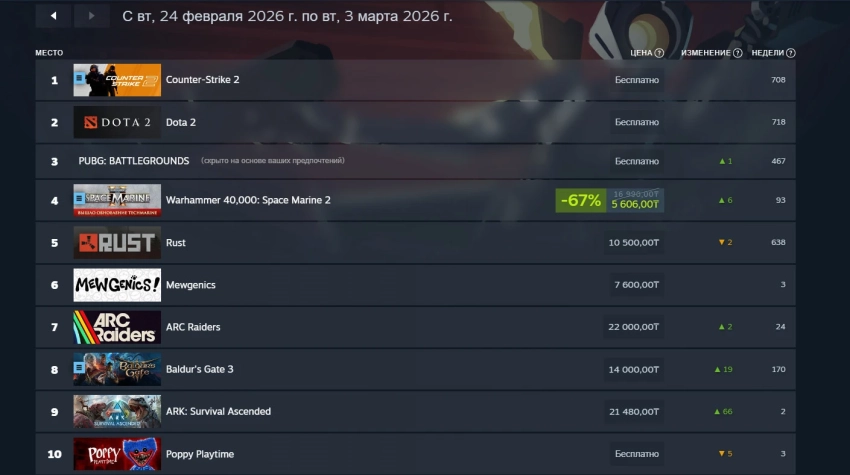 В российском сегменте Steam примечательных изменений не так много. Warhammer 40,000: Space Marine 2 за счёт крупного обновления с новым классом поднялась с десятого на шестое место. Также рост на 19 и 66 мест выше оказались Baldur’s Gate III и ARK: Survival Ascended — обе игры вошли в первую десятку по прибыльности в регионе.
