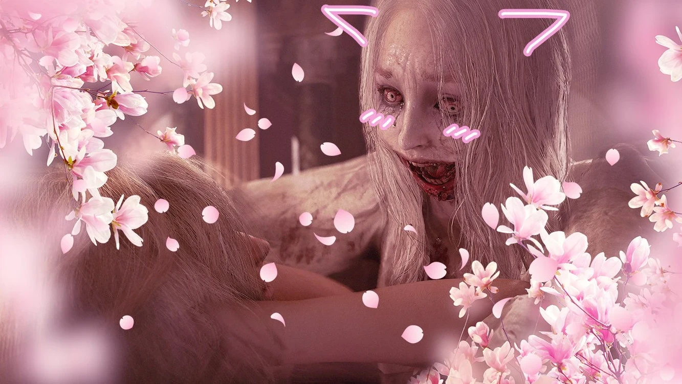 Например, мрачная картинка приобрела розовый фильтр, а белые лепестки дополнили беззаботную атмосферу. Судя по всему, зомби в «нестрашном» режиме отныне лезут не кусаться, а обниматься — ходячему мертвецу авторы Resident Evil Requiem пририсовали умилительные кошачьи ушки.