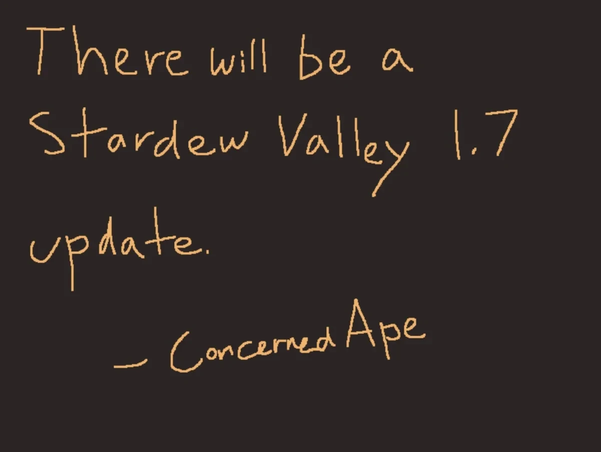 Однако никаких деталей о версии 1.7 нет. Это же касается и окна релиза — даже ориентировочных сроков Барон решил не давать, чтобы не дразнить фанатов и не разочаровывать их в том случае, если обновление придётся отложить. Также «по плану» создание новой версии не должно помешать разработке Haunted Chocolatier — будущей игре Эрика, которую он уже откладывал из-за обновлений Stardew Valley.