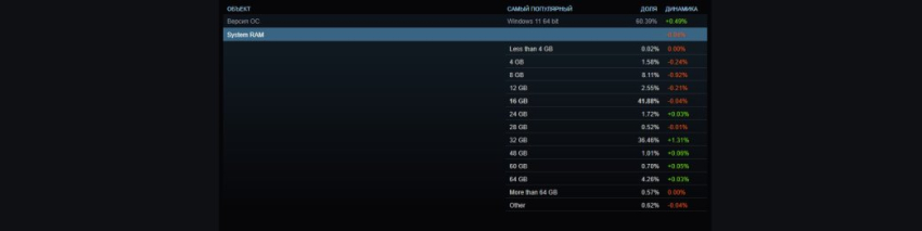 2 фото16 ГБ оперативной памяти — классика, которой может похвастаться 41,88% пользователей Steam. Однако в августе число игроков с этим объёмом памяти уменьшилось, тогда как варианты систем с 24 ГБ (+0,03%), 32 ГБ (+1,31%), 48 ГБ (+0,06%), 60 ГБ (+0,05%:) и 64 ГБ (+0,03%) стали слегка популярнее. Все объёмы оперативной памяти менее 24 ГБ показывают небольшое снижение.